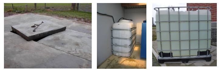 De opslagtank kan zowel ondergronds als bovengronds geplaatst worden. Bij een bovengrondse opslagtank moet het water opgepompt worden vanuit een verzamelputje. De opslagtank moet lekdicht zijn en bestand zijn tegen gewasbeschermingsmiddelen. Bij ondergrondse citernes kan daarom gekozen worden voor HSR-citernes (citernes voor mestopslag). De opslagtank mag in geen geval verbonden worden met de riolering of het oppervlaktewater. Een bovengrondse tank moet vorstbestendig zijn of moet vorstvrij worden opgesteld (zie figuur 1).