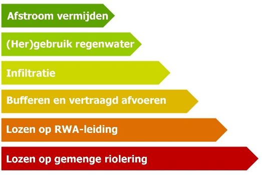 Rekening houdend met de klimaatverandering beoogt men om regenwater zolang mogelijk op eigen terrein te houden door afstroom te vermijden, het regenwater maximaal op te slaan en te gebruiken en infiltratie te bevorderen. Pas in laatste instantie wordt water (vertraagd) afgevoerd of geloosd. Dit steunt op het toepassen van de Ladder van Lansink.