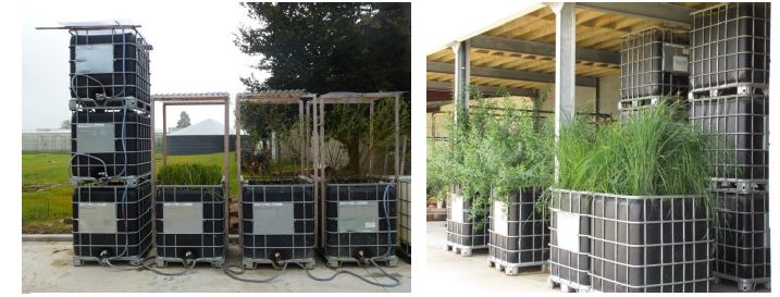 Een eerste type biozuiveringssysteem is de biofilter. Een traditionele biofilter wordt qua functie in twee delen gesplitst: het eerste deel omvat drie op elkaar gestapelde bakken met een inhoud van 1 m³ (IBC-containers) en wordt de filtereenheid genoemd. Het tweede deel omvat plantenbakken, die naast elkaar zijn opgesteld, en wordt de verdampingseenheid genoemd (zie onderstaande figuur: biofilters in de praktijk).