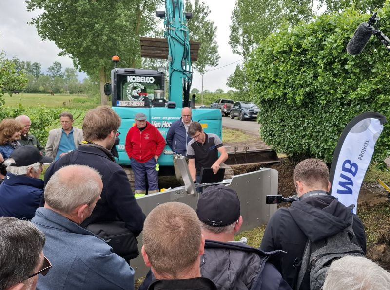 De plaatsing van de eerste stuw is een feit. De belangstelling voor dit evenement was groot. |