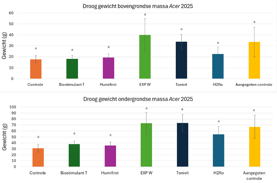 In 2024 en 2025 werd een proef aangelegd in 2-jarig bosgoed Acer pseudoplatanus, waarbij vijf producten werden getest ten opzichte van een onbehandelde controle en een controle die 2-wekelijks water kreeg: een experimentele biostimulant op basis van zeewierextract Biostimulant T (10 l/ha, 2-wekelijks aangegoten), Humifirst (15 kg/ha, in het plantgat), een experimentele wetting agent EXP W (10 l/ha, 2-wekelijks aangegoten), Tonivit (10 l/ha, éénmalig aangegoten op de wortels bij aanplant) en H2Flo (0,5 ml/boom, maandelijks aangegoten). De plantkwaliteit werd 2-wekelijks opgevolgd via lengtemetingen. In het najaar van 2025 werd ook de boven- en ondergrondse biomassa bepaald (Figuur 2).