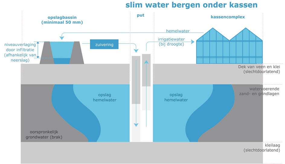 Figuur: schematische weergave van ondergrondse waterberging ten behoeve van gietwatervoorziening in de glastuinbouw (bron: stowa).