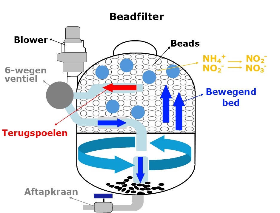 Beadfilters zien eruit als een zandfilter maar werken toch op een andere manier. De filter is gevuld met duizenden zogenaamde "beads" of plastic korreltjes. Doordat de korreltjes perfect tegen elkaar aansluiten, creëert men enerzijds een enorme hechtingsoppervlakte (1500 m² per m³) voor bacteriën op een beperkt volume. Deze bacteriën kunnen instaan voor het afbreken van ammonium en nitriet.