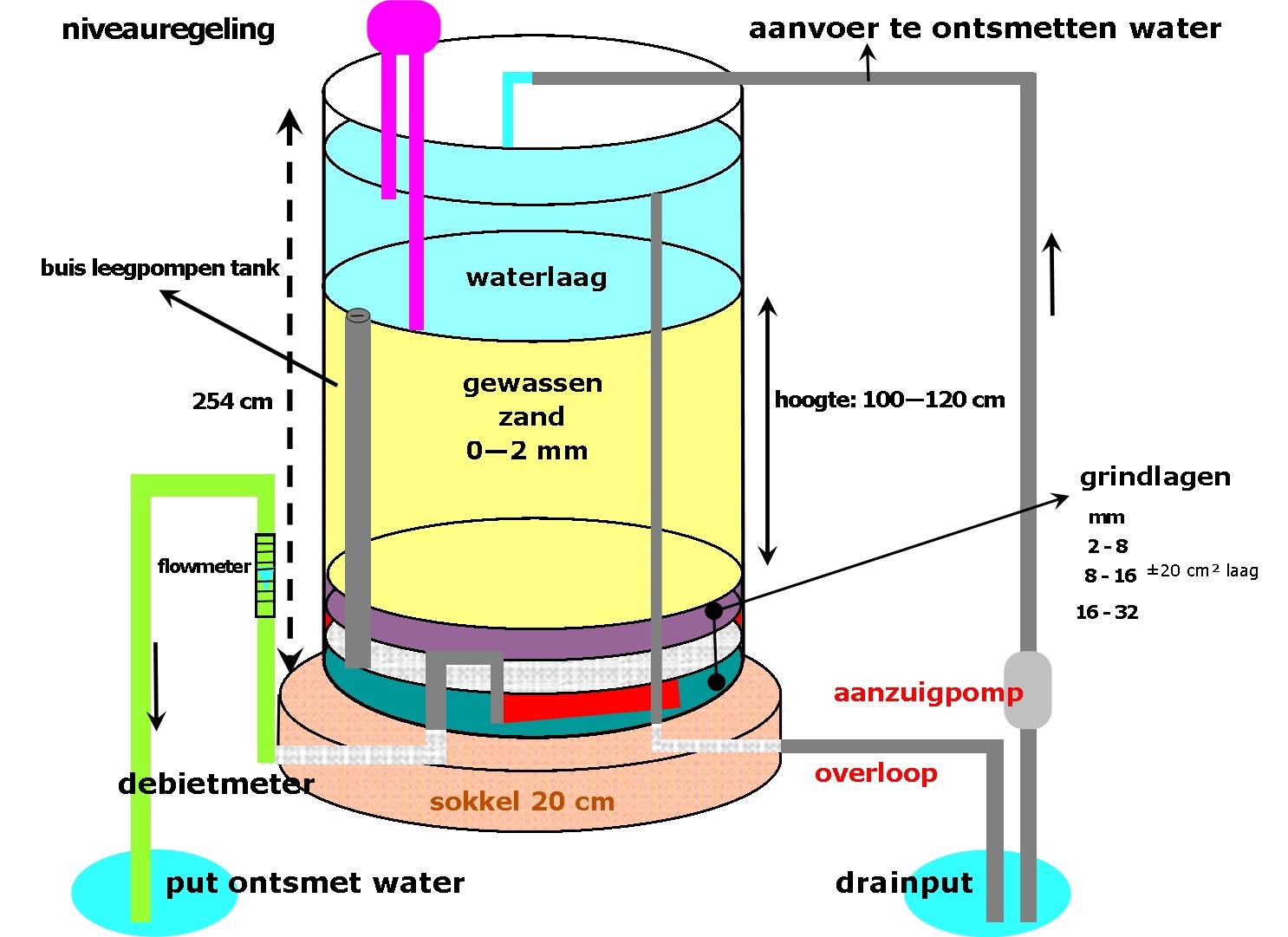 Figuur: schematische voorstelling van een langzame zandfilter met drie grindlagen en een zandlaag