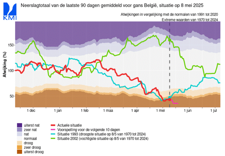 De grafiek toont de totale neerslagsom van de voorbije 90 dagen. 8 mei is de droogste situatie sinds de metingen vanaf 1970 (Bron: KMI)