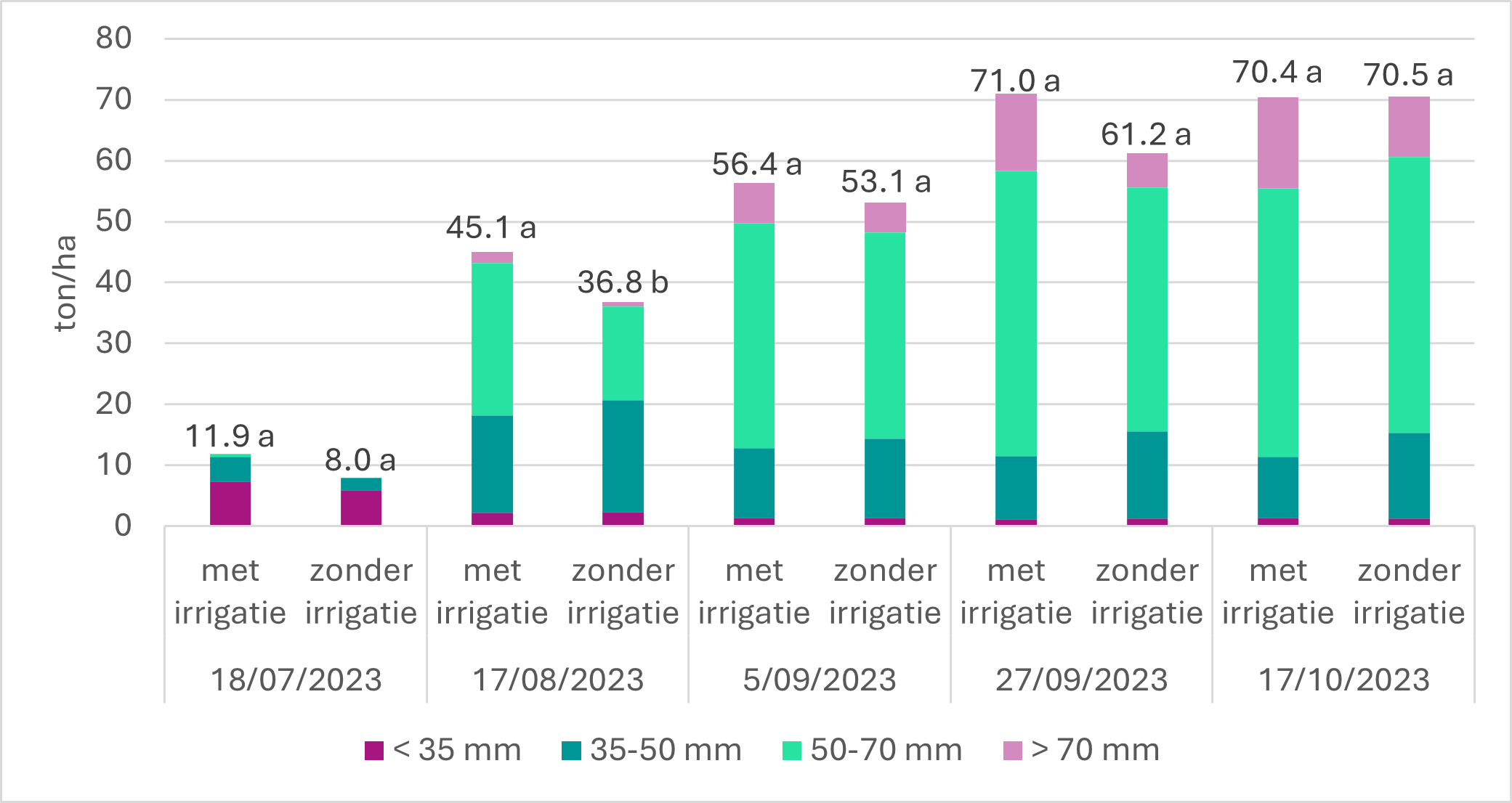 De cijfers vertoonden, bekeken over het volledige groeiseizoen, significant hogere opbrengsten voor het geïrrigeerde object in vergelijking met het niet-geïrrigeerde object. Indien dit per staaldatum werd bekeken was enkel op 17 augustus de totale knolopbrengst significant hoger voor de geïrrigeerde veldjes (Figuur 2). Later liep het niet-geïrrigeerde object zijn achterstand tegenover het geïrrigeerde object in door langer door te groeien.