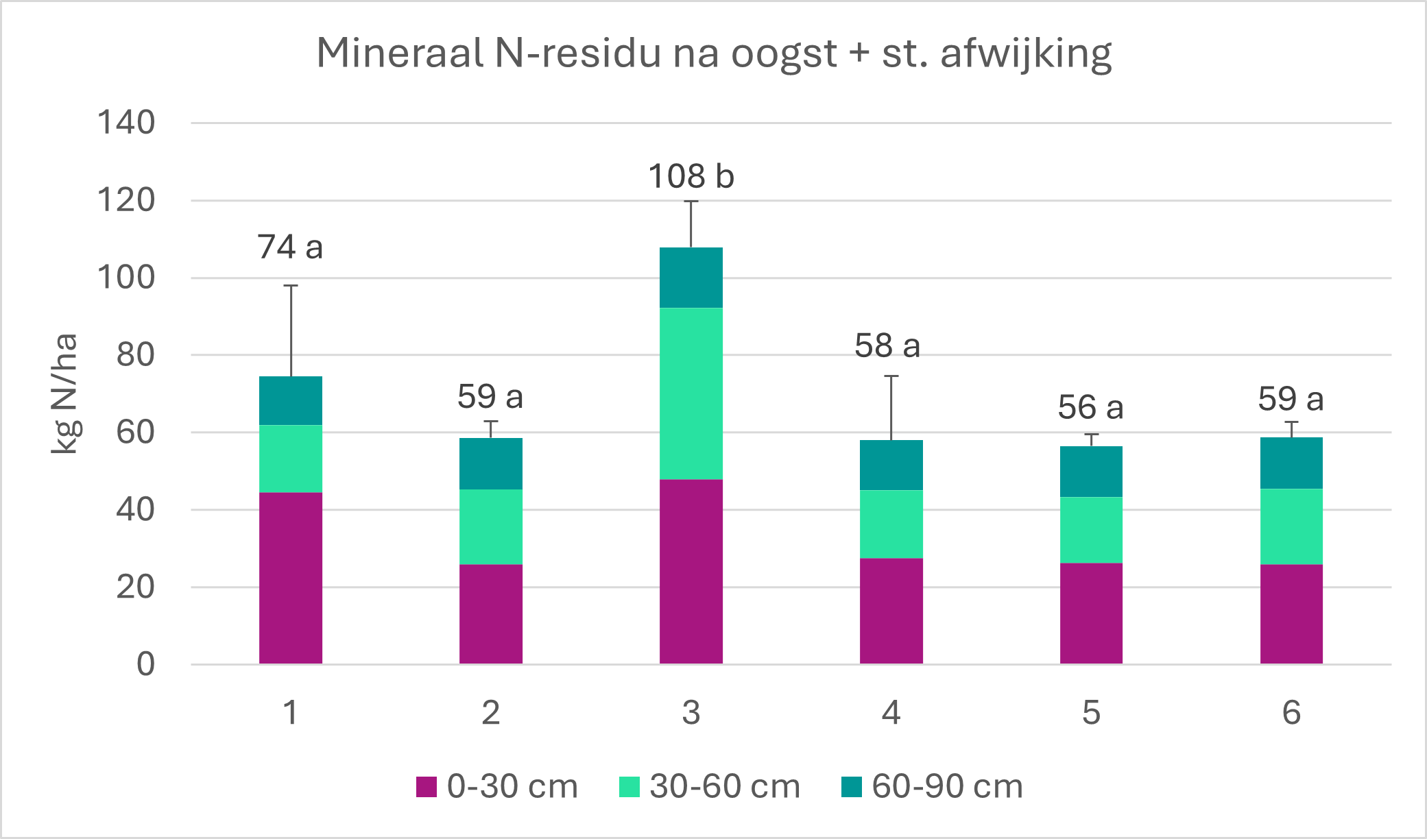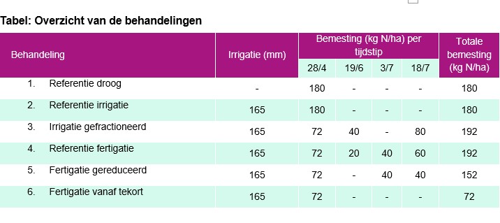 Onze resultaten tonen aan dat met fertigatie de mooiste opbrengsten in combinatie met de laagste nitraatresiduen worden gehaald. Ook met een lage basisbemesting en irrigatie zonder bijbemesting (object 6) werden dezelfde resultaten gehaald als bij een hoge basisbemesting en irrigatie (object 2). De late bijbemesting met korrel heeft dan weer gezorgd voor een verhoogd nitraatresidu voor object 3.