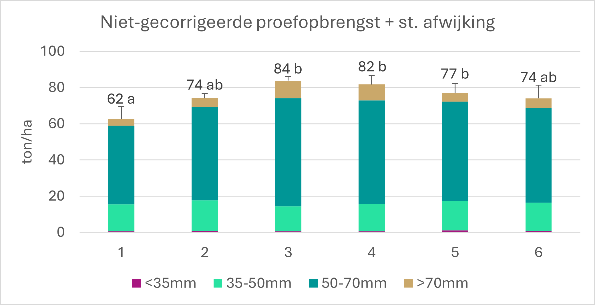 De niet-gecorrigeerde proefopbrengsten waren algemeen hoog. De opbrengsten voor objecten 3, 4 en 5 waren significant hoger dan die voor object 1. Onderling werden tussen alle 5 geïrrigeerde objecten geen significante verschillen waargenomen in de opbrengst. De onderwatergewichten lagen tussen 415 en 434 g per 5 kg en waren voor alle objecten vergelijkbaar. Het nitraatresidu was significant hoger voor object 3 dan voor de andere 5 objecten.