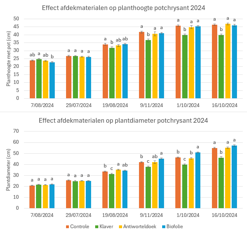 Figuur 3. Effect bodemafdekmaterialen op de gewasgroei van potchrysant.