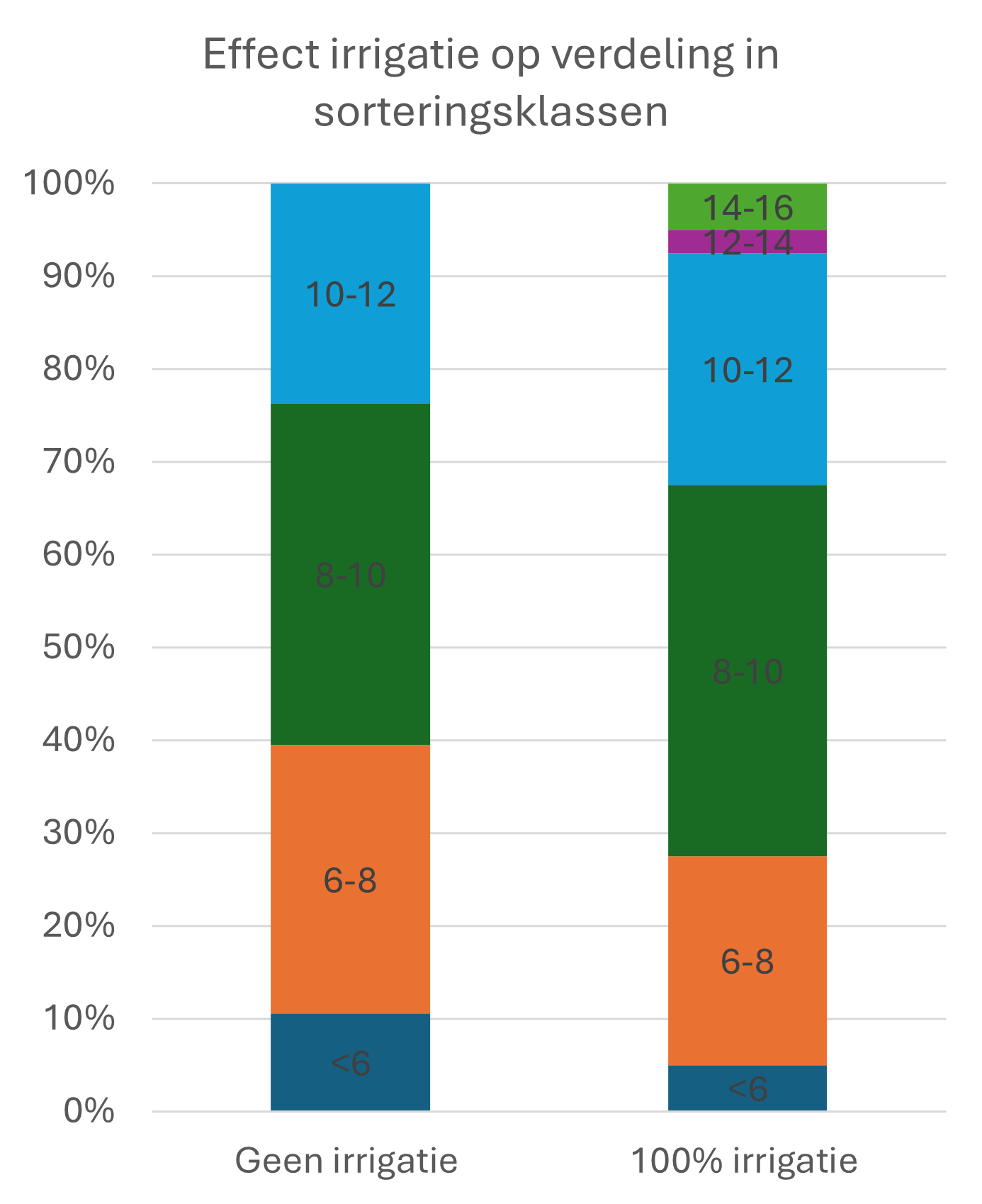 Vanaf september bood irrigatie weinig meerwaarde. Hoewel het najaar vaak nog warm en zonnig is en het weer nog groeizaam lijkt, levert de toegediende irrigatie amper tot geen extra groei meer op. Na vier jaar hadden de geïrrigeerde bomen een grotere stamdiameter en werd er een verschuiving in de sorteringsklassen waargenomen (Figuur 1), maar is deze verschuiving ook economisch rendabel?