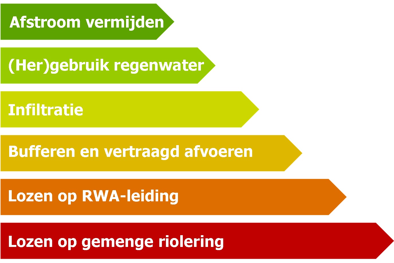 Men beoogt om regenwater zolang mogelijk op eigen terrein te houden door natuurlijke afvloei of infiltratie, mogelijkheid tot hergebruik en pas in laatste instantie de aansluiting op openbaar domein. In het kader van waterbeheer moet ingezet worden op het toepassen van de Ladder van Lansink.
